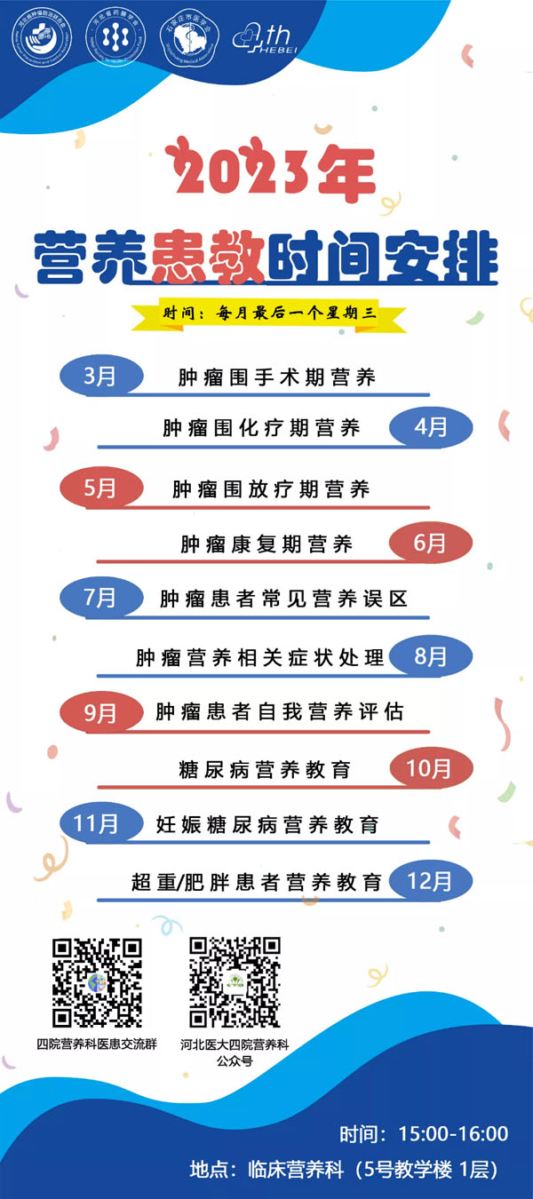 临床营养科的营养宣传活动并不局限于“全民营养周”,而是一项长期的常态化活动。在医院党委的大力支持下,临床营养科在科普宣教的道路上守正创新、砥砺前进,努力为更多患者朋友及广大居民提供优质、常态化的健康营养科普知识,为“健康中国”“健康河北”做出更多贡献。